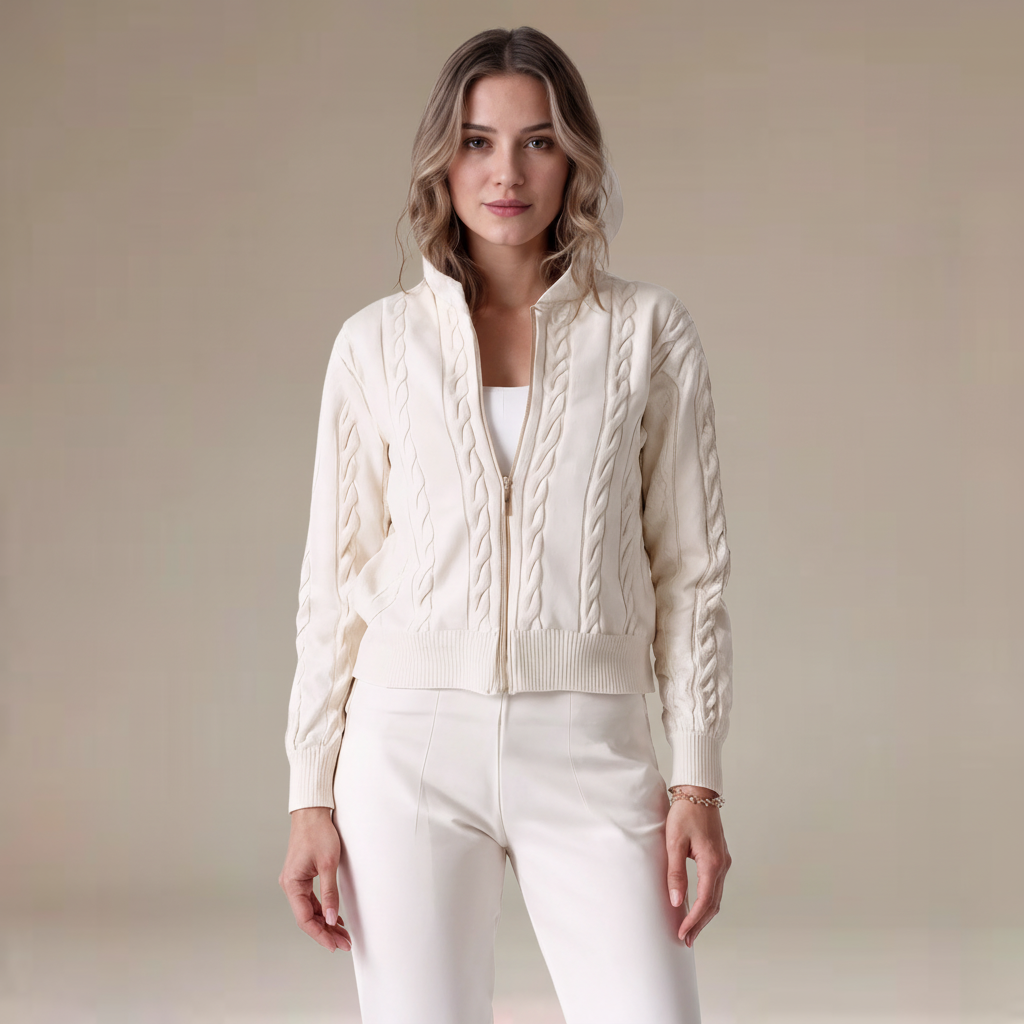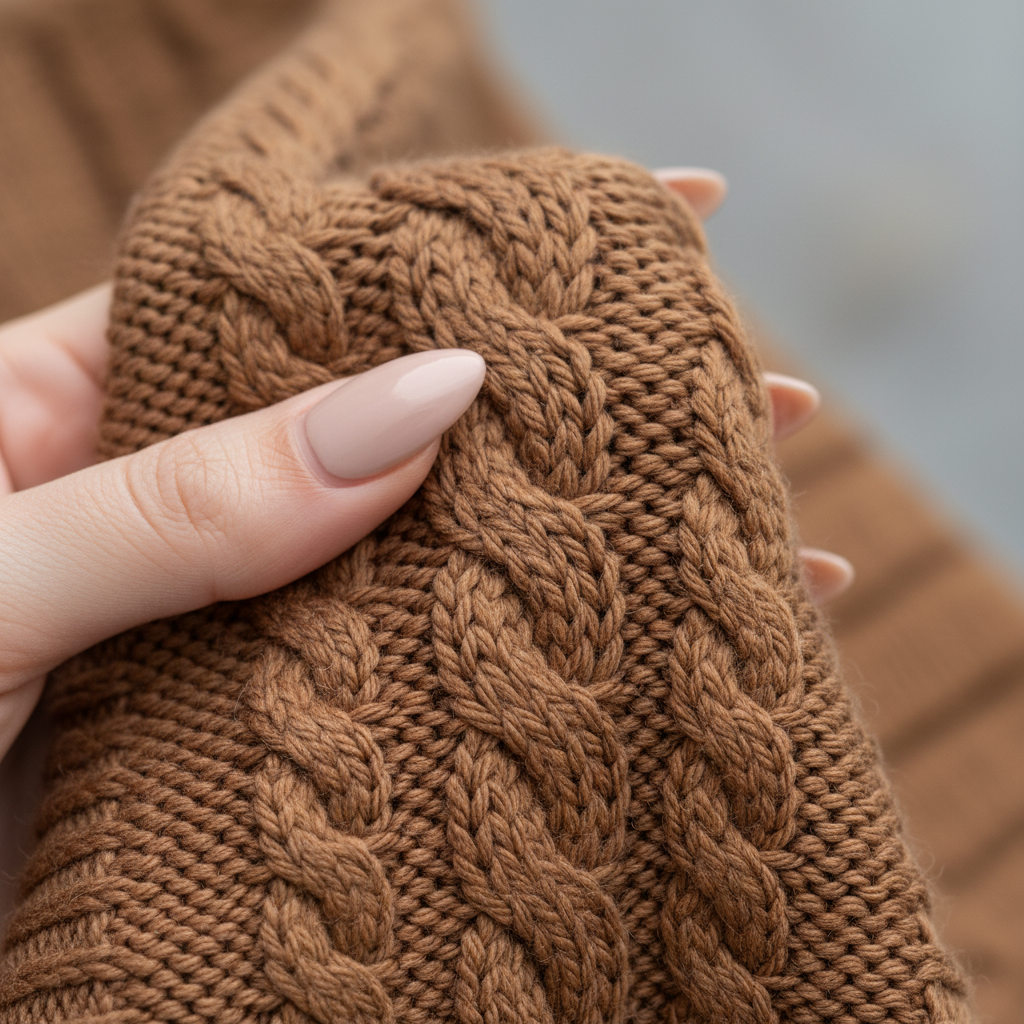 - Textura em tranças no tricô que eleva o acabamento e deixa o look mais sofisticado.