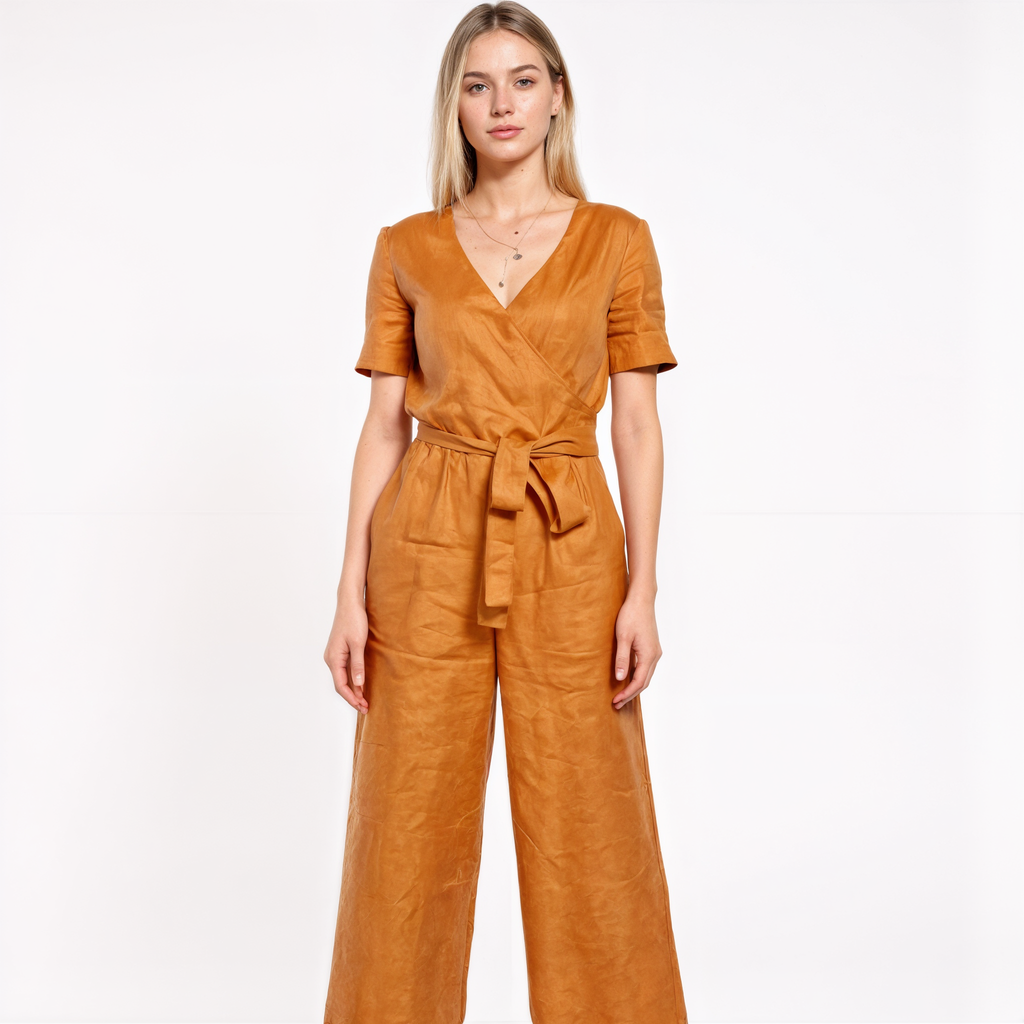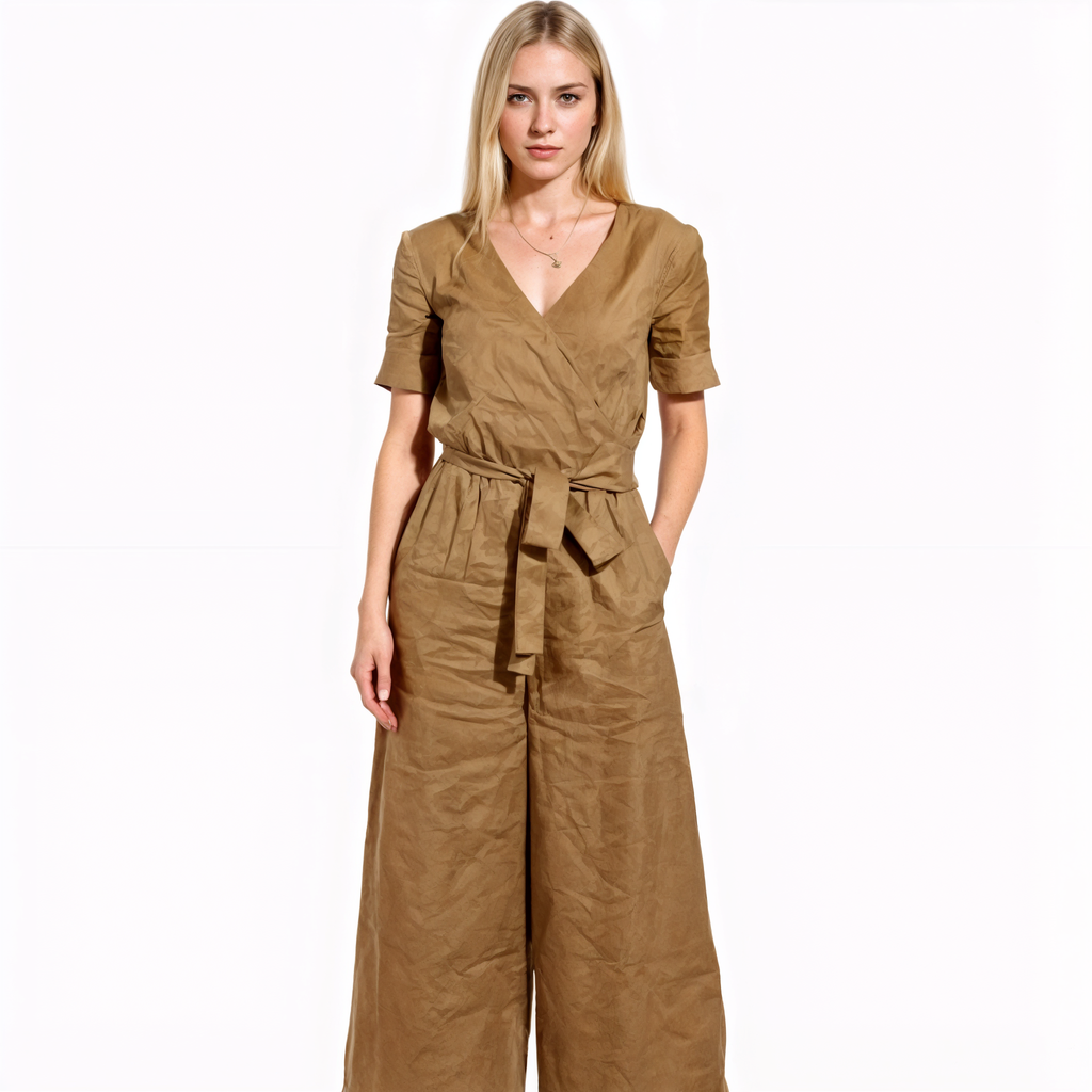 - Modelagem: elegante, com perna ampla e cintura ajustável por amarração